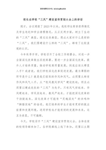 / 【七哥公文】2024年:校长在学校“三风”建设宣传贯彻大会上的讲话+更多免费公文+VX:QiGeGongWen2024