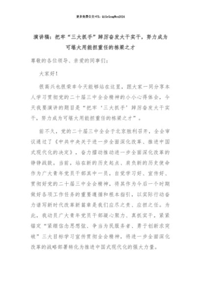【七哥公文】2024年:演讲稿:把牢“三大抓手”踔厉奋发大干实干,努力成为可堪大用能担重任的栋梁之才+更多免费公文+VX:QiGeGongWen2024