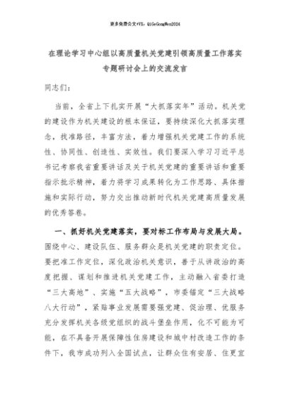 【七哥公文】2024年:在理论学习中心组以高质量机关党建引领高质量工作落实专题研讨会上的交流发言+更多免费公文+VX:QiGeGongWen2024