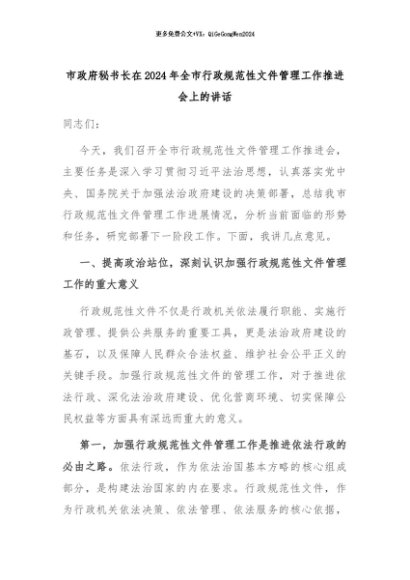 【七哥公文】2024年:市政府秘书长在2024年全市行政规范性文件管理工作推进会上的讲话+更多免费公文+VX:QiGeGongWen2024