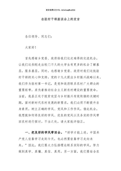 / 【七哥公文】2024年:在驻村干部座谈会上的发言+更多免费公文+VX:QiGeGongWen2024