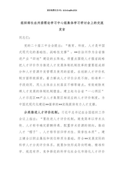 【七哥公文】2024年:组织部长在州委理论学习中心组集体学习研讨会上的交流发言+更多免费公文+VX:QiGeGongWen2024