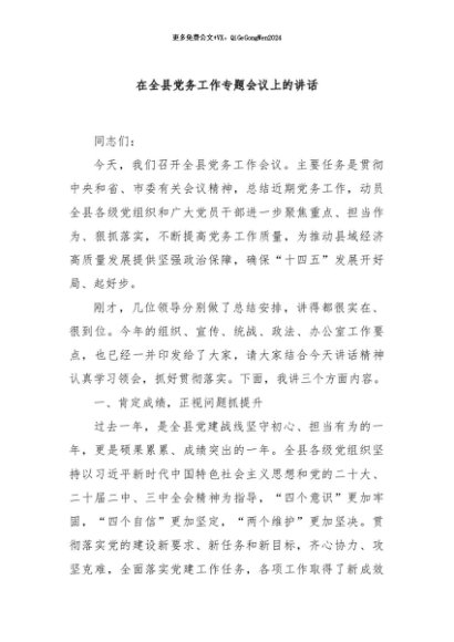 / 【七哥公文】2024年:在全县党务工作专题会议上的讲话+更多免费公文+VX:QiGeGongWen2024