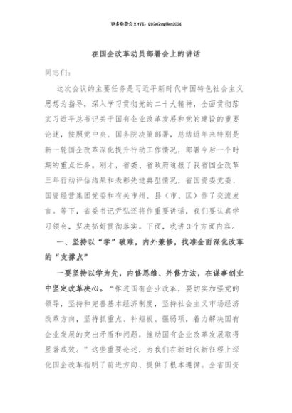 / 【七哥公文】2024年:在国企改革动员部署会上的讲话+更多免费公文+VX:QiGeGongWen2024