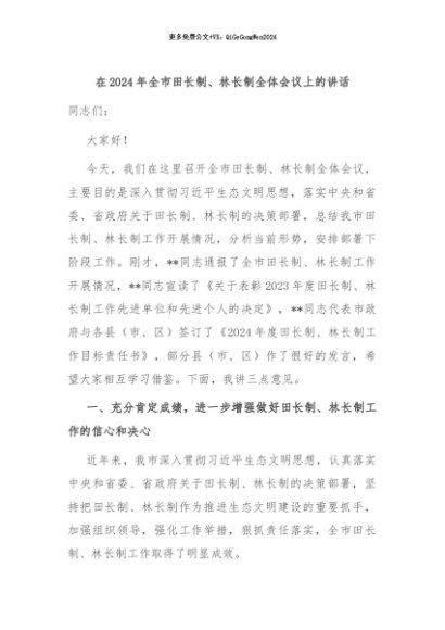 / 【七哥公文】2024年:在2024年全市田长制、林长制全体会议上的讲话+更多免费公文+VX:QiGeGongWen2024