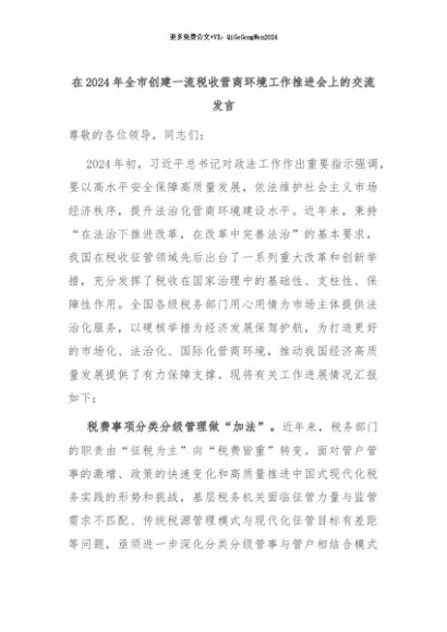 【七哥公文】2024年:在2024年全市创建一流税收营商环境工作推进会上的交流发言+更多免费公文+VX:QiGeGongWen2024