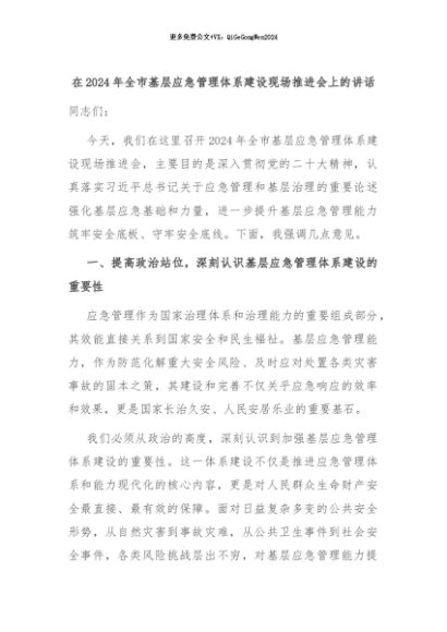 【七哥公文】2024年:在2024年全市基层应急管理体系建设现场推进会上的讲话+更多免费公文+VX:QiGeGongWen2024