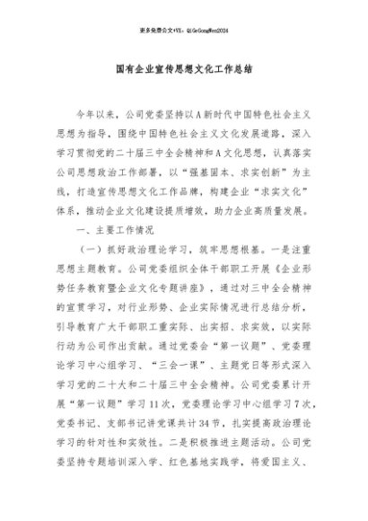 / 【七哥公文】2024年:国有企业宣传思想文化工作总结+更多免费公文+VX:QiGeGongWen2024