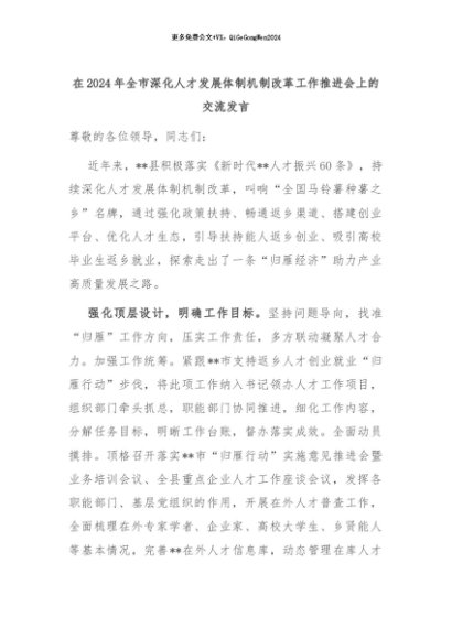 【七哥公文】2024年:在2024年全市深化人才发展体制机制改革工作推进会上的交流发言+更多免费公文+VX:QiGeGongWen2024