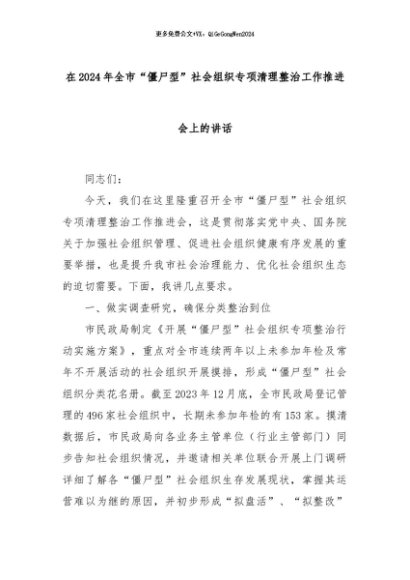 【七哥公文】2024年:在2024年全市“僵尸型”社会组织专项清理整治工作推进会上的讲话+更多免费公文+VX:QiGeGongWen2024