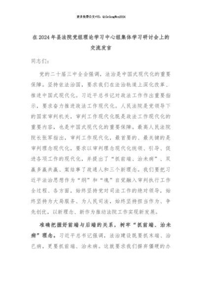 【七哥公文】2024年:在2024年县法院党组理论学习中心组集体学习研讨会上的交流发言+更多免费公文+VX:QiGeGongWen2024