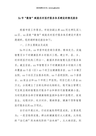 / 【七哥公文】2024年:Xx市“数智”赋能农村医疗服务体系建设的情况报告+更多免费公文+VX:QiGeGongWen2024