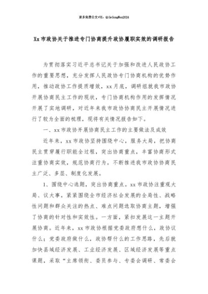 【七哥公文】2024年:Xx市政协关于推进专门协商提升政协履职实效的调研报告+更多免费公文+VX:QiGeGongWen2024