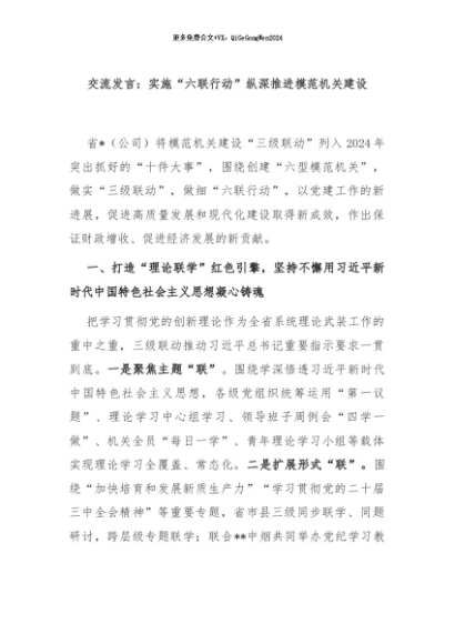 / 【七哥公文】2024年:交流发言:实施“六联行动”纵深推进模范机关建设+更多免费公文+VX:QiGeGongWen2024