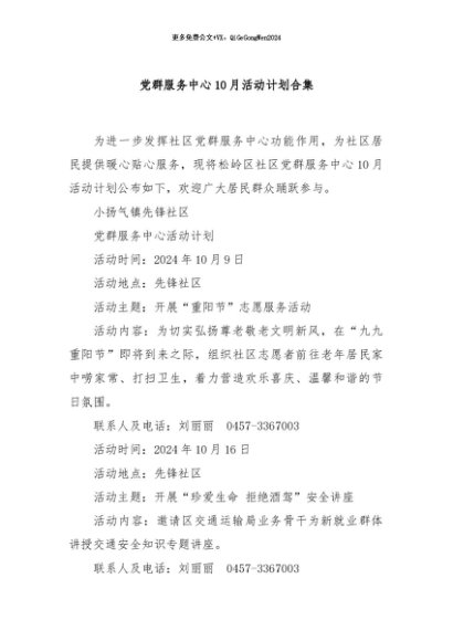 / 【七哥公文】2024年:党群服务中心10月活动计划合集+更多免费公文+VX:QiGeGongWen2024