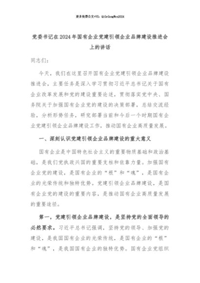 【七哥公文】2024年:党委书记在2024年国有企业党建引领企业品牌建设推进会上的讲话+更多免费公文+VX:QiGeGongWen2024