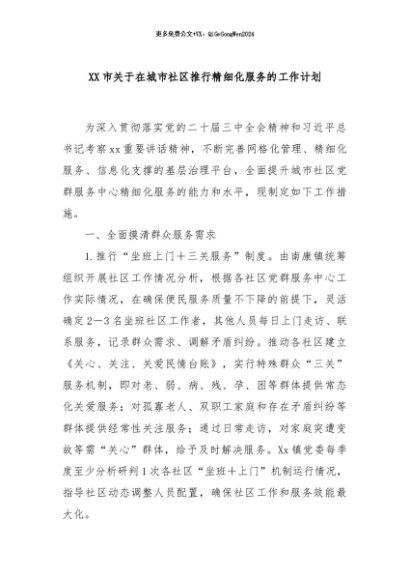 / 【七哥公文】2024年:XX市关于在城市社区推行精细化服务的工作计划+更多免费公文+VX:QiGeGongWen2024