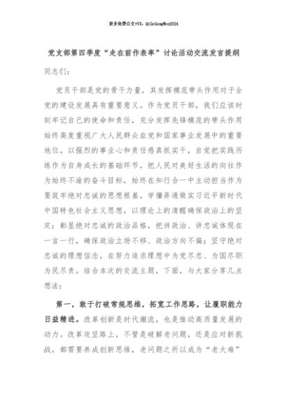 【七哥公文】2024年:党支部第四季度“走在前作表率”讨论活动交流发言提纲+更多免费公文+VX:QiGeGongWen2024