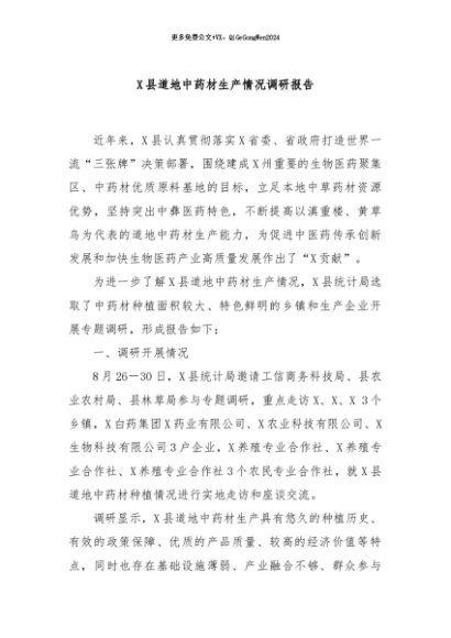/ 【七哥公文】2024年:X县道地中药材生产情况调研报告+更多免费公文+VX:QiGeGongWen2024