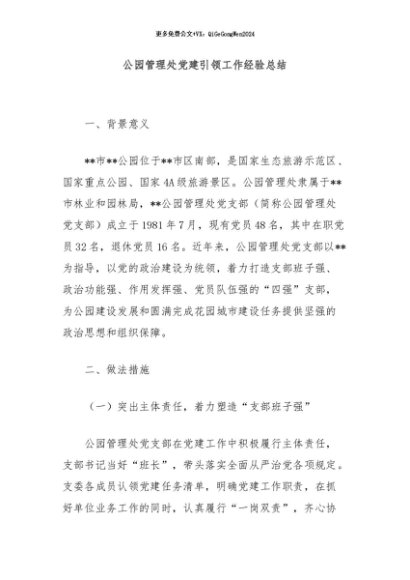 / 【七哥公文】2024年:公园管理处党建引领工作经验总结+更多免费公文+VX:QiGeGongWen2024