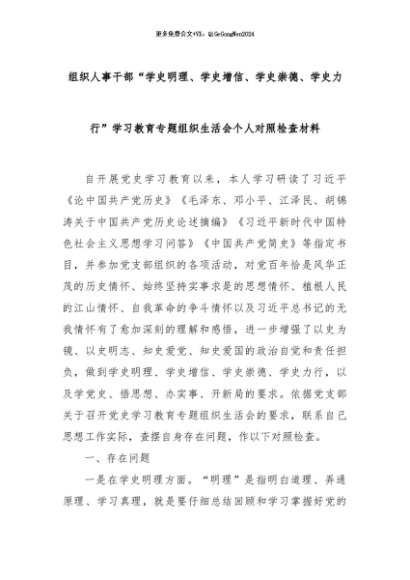 【七哥公文】2024年:组织人事干部“学史明理、 学史增信、 学史崇德、 学史力行” 学习教育专题组织生活会个人对照检查材料+更多免费公文+VX:QiGeGongWen2024