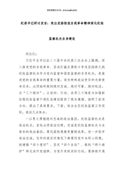 【七哥公文】2024年:纪委书记研讨发言:突出发扬彻底自我革命精神深化纪检监察机关自身建设+更多免费公文+VX:QiGeGongWen2024