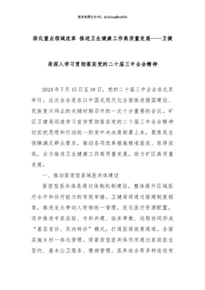 【七哥公文】2024年:深化重点领域改革 推进卫生健康工作高质量发展——卫健局深入学习贯彻落实党的二十届三中全会精神 (1)+更多免费公文+VX:QiGeGongWen2024