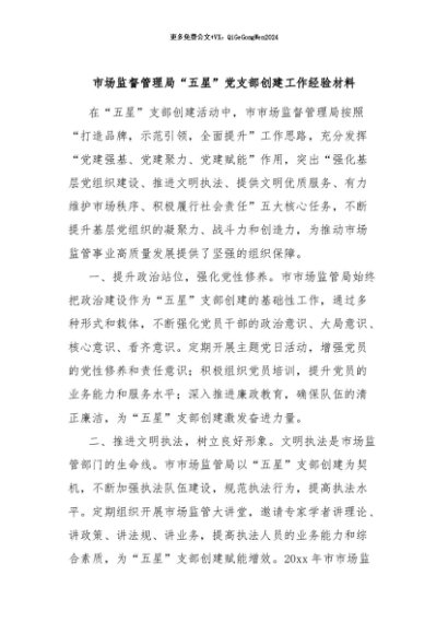 / 【七哥公文】2024年:市场监督管理局“五星”党支部创建工作经验材料+更多免费公文+VX:QiGeGongWen2024