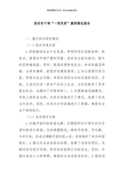 / 【七哥公文】2024年:某村村干部“一岗双责”履职情况报告+更多免费公文+VX:QiGeGongWen2024