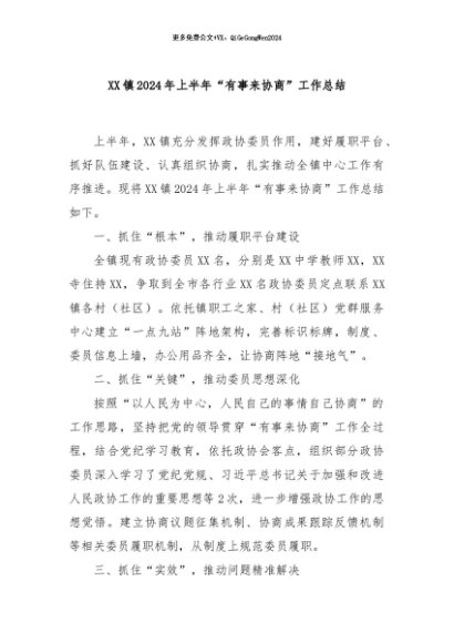 / 【七哥公文】2024年:XX镇2024年上半年“有事来协商”工作总结+更多免费公文+VX:QiGeGongWen2024