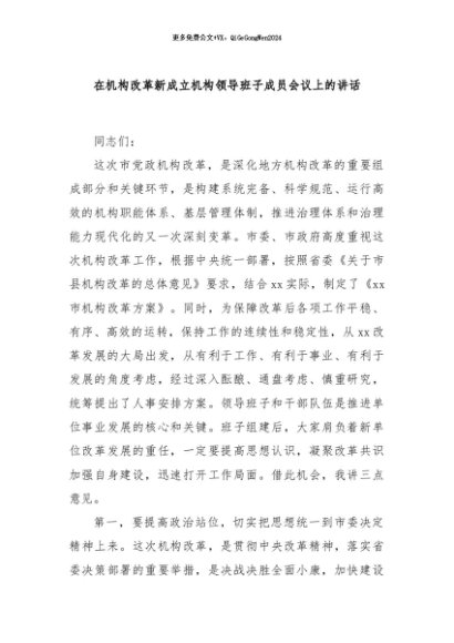 / 【七哥公文】2024年:在机构改革新成立机构领导班子成员会议上的讲话+更多免费公文+VX:QiGeGongWen2024