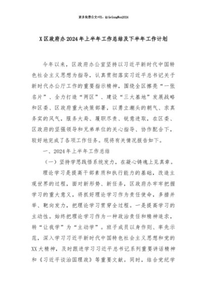 【七哥公文】2024年:X区政府办2024年上半年工作总结及下半年工作计划+更多免费公文+VX:QiGeGongWen2024