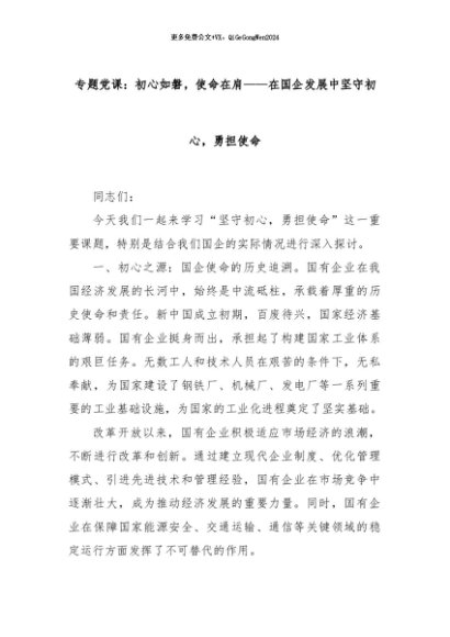【七哥公文】2024年:专题党课:初心如磐,使命在肩——在国企发展中坚守初心,勇担使命+更多免费公文+VX:QiGeGongWen2024