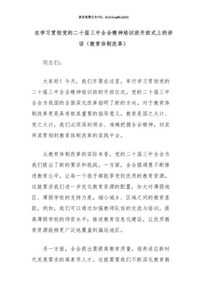 【七哥公文】2024年:在学习贯彻党的二十届三中全会精神培训班开班式上的讲话(教育体制改革) (1)+更多免费公文+VX:QiGeGongWen2024