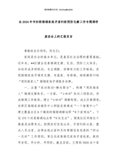 【七哥公文】2024年:在2024年市妇联婚姻家庭矛盾纠纷预防化解工作专题调研座谈会上的汇报发言+更多免费公文+VX:QiGeGongWen2024