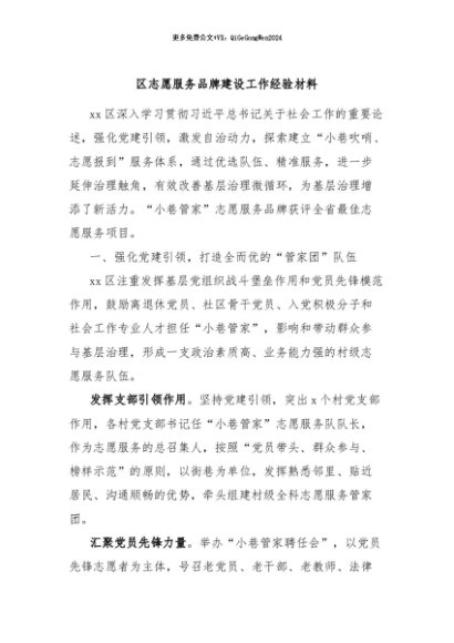 / 【七哥公文】2024年:区志愿服务品牌建设工作经验材料+更多免费公文+VX:QiGeGongWen2024