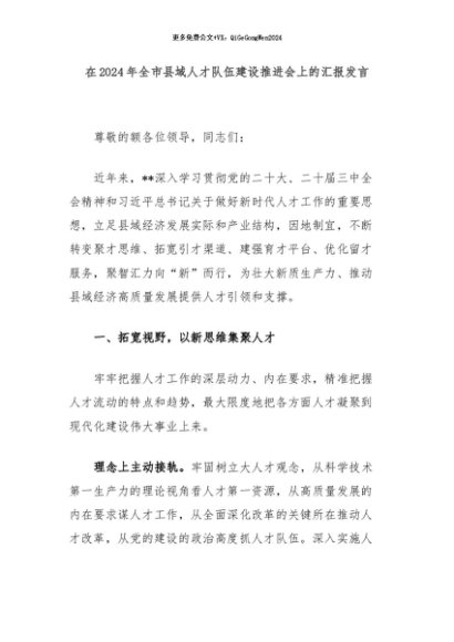 【七哥公文】2024年:在2024年全市县域人才队伍建设推进会上的汇报发言+更多免费公文+VX:QiGeGongWen2024