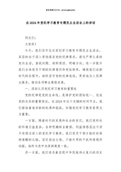 / 【七哥公文】2024年:在2024年党纪学习教育专题民主生活会上的讲话+更多免费公文+VX:QiGeGongWen2024