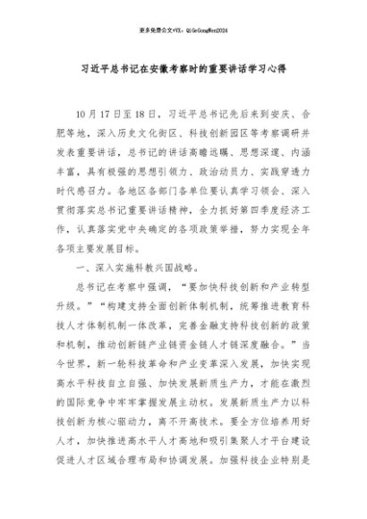 / 【七哥公文】2024年:习近平总书记在安徽考察时的重要讲话学习心得+更多免费公文+VX:QiGeGongWen2024