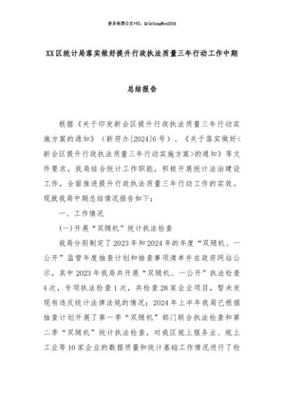 【七哥公文】2024年:XX区统计局落实做好提升行政执法质量三年行动工作中期总结报告+更多免费公文+VX:QiGeGongWen2024
