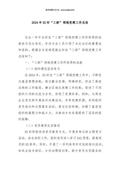 / 【七哥公文】2024年:2024 年 XX 村“三新”领域党建工作总结+更多免费公文+VX:QiGeGongWen2024