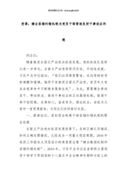 【七哥公文】2024年:党课:健全容错纠错机制为党员干部营造良好干事创业环境+更多免费公文+VX:QiGeGongWen2024