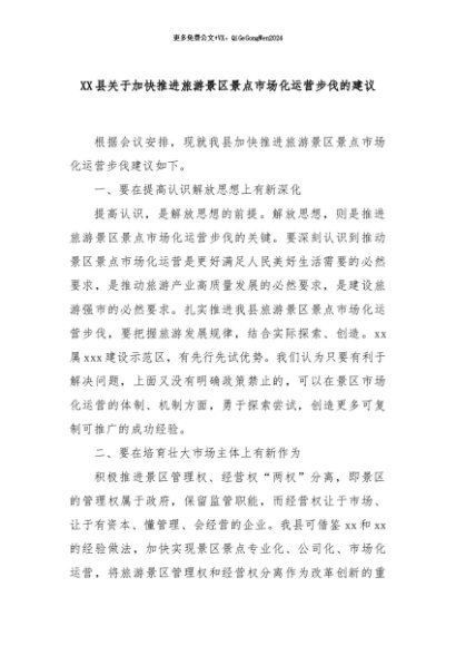 【七哥公文】2024年:XX县关于加快推进旅游景区景点市场化运营步伐的建议+更多免费公文+VX:QiGeGongWen2024