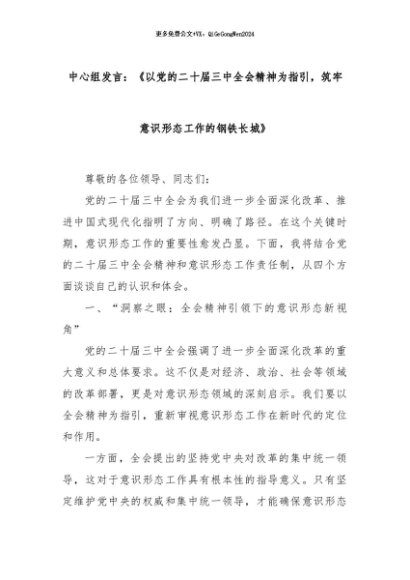 【七哥公文】2024年:中心组发言:《以党的二十届三中全会精神为指引,筑牢意识形态工作的钢铁长城》 (1)+更多免费公文+VX:QiGeGongWen2024