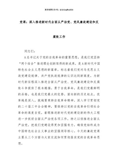 【七哥公文】2024年:党课:深入推进新时代全面从严治党、党风廉政建设和反腐败工作+更多免费公文+VX:QiGeGongWen2024
