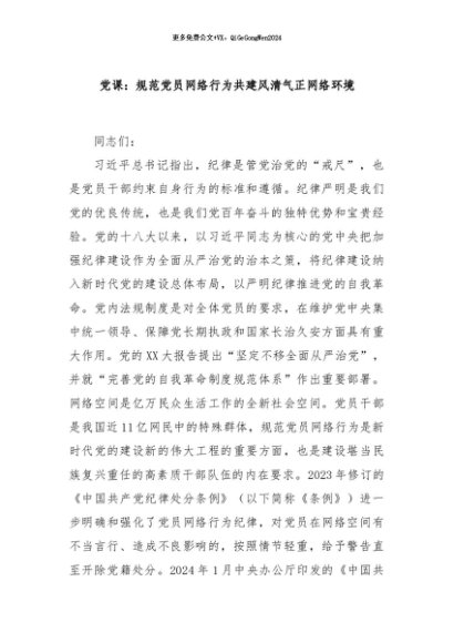 / 【七哥公文】2024年:党课:规范党员网络行为共建风清气正网络环境+更多免费公文+VX:QiGeGongWen2024