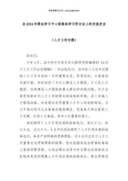【七哥公文】2024年:在2024年理论学习中心组集体学习研讨会上的交流发言(人才工作专题)+更多免费公文+VX:QiGeGongWen2024