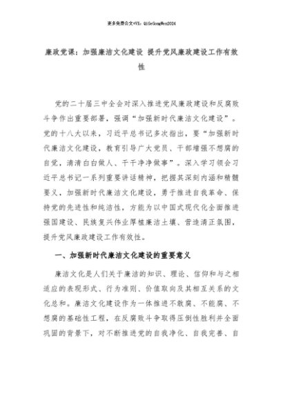 【七哥公文】2024年:廉政党课:加强廉洁文化建设 提升党风廉政建设工作有效性+更多免费公文+VX:QiGeGongWen2024