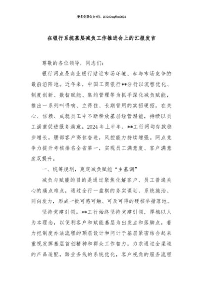 / 【七哥公文】2024年:在银行系统基层减负工作推进会上的汇报发言+更多免费公文+VX:QiGeGongWen2024