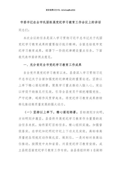【七哥公文】2024年:市委书记在全市巩固拓展党纪学习教育工作会议上的讲话+更多免费公文+VX:QiGeGongWen2024